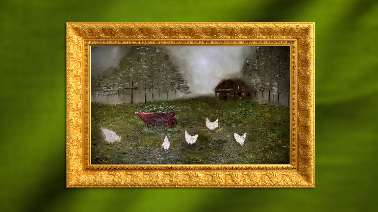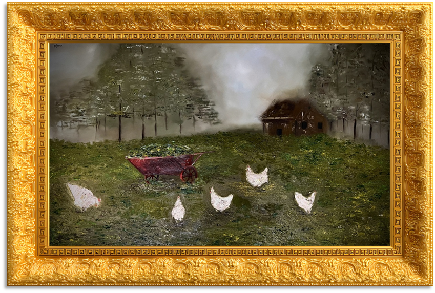Visualizing the poem's opening, “So much depends upon”, was one of my greatest challenges. I had to ask what exactly almost everything depends on. The next line gives us the answer: the red wheelbarrow. In my translation, the focus had to stay there. To convey this sense of “dependence” and “importance,” I used perspective to manipulate the sense of scale, rendering the house and forest as small, vague details in the distance. This deliberate choice makes the background recede, drawing all the focus onto the red wheelbarrow and the chickens in the foreground.