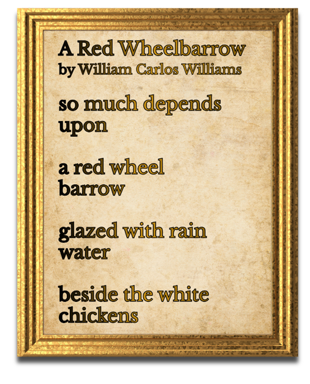 - Williams, W. C. (1938). The red wheelbarrow. In C. MacGowan (Ed.), The collected poems: Volume I, 1909–1939 (p. 224). New Directions Publishing Corporation.