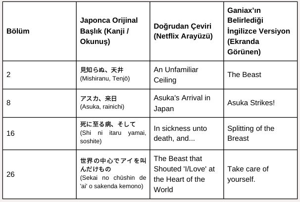 doğrudan çevirisinin bu bağlama göre daha doğru olduğu söylenebilir. Benzer şekilde, serinin finali olan 26. Bölüm, Japonca aslında “The Beast that Shouted 'I/Love' at the Heart of the World” (Dünyanın Merkezinde Aşkı Haykıran Canavar) gibi son derece şiirsel ve felsefi bir isme sahipken, ekranda beliren Gainax İngilizcesi sadece “Take care of yourself” (Kendine iyi bak) cümlesinden ibarettir. Bu durum, platformun kendi yönergelerine sığınarak ekrandaki metni çevirmemesi, ancak menüde farklı bir başlık sunmasıyla açıklanabilir.